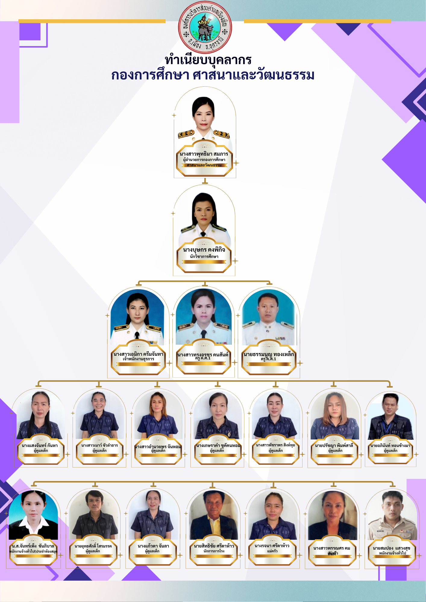 กองการศึกษา ศาสนาและวัฒนธรรม มีการกำหนดฝ่าย/กลุ่มงาน/งานภายใน ดังนี้