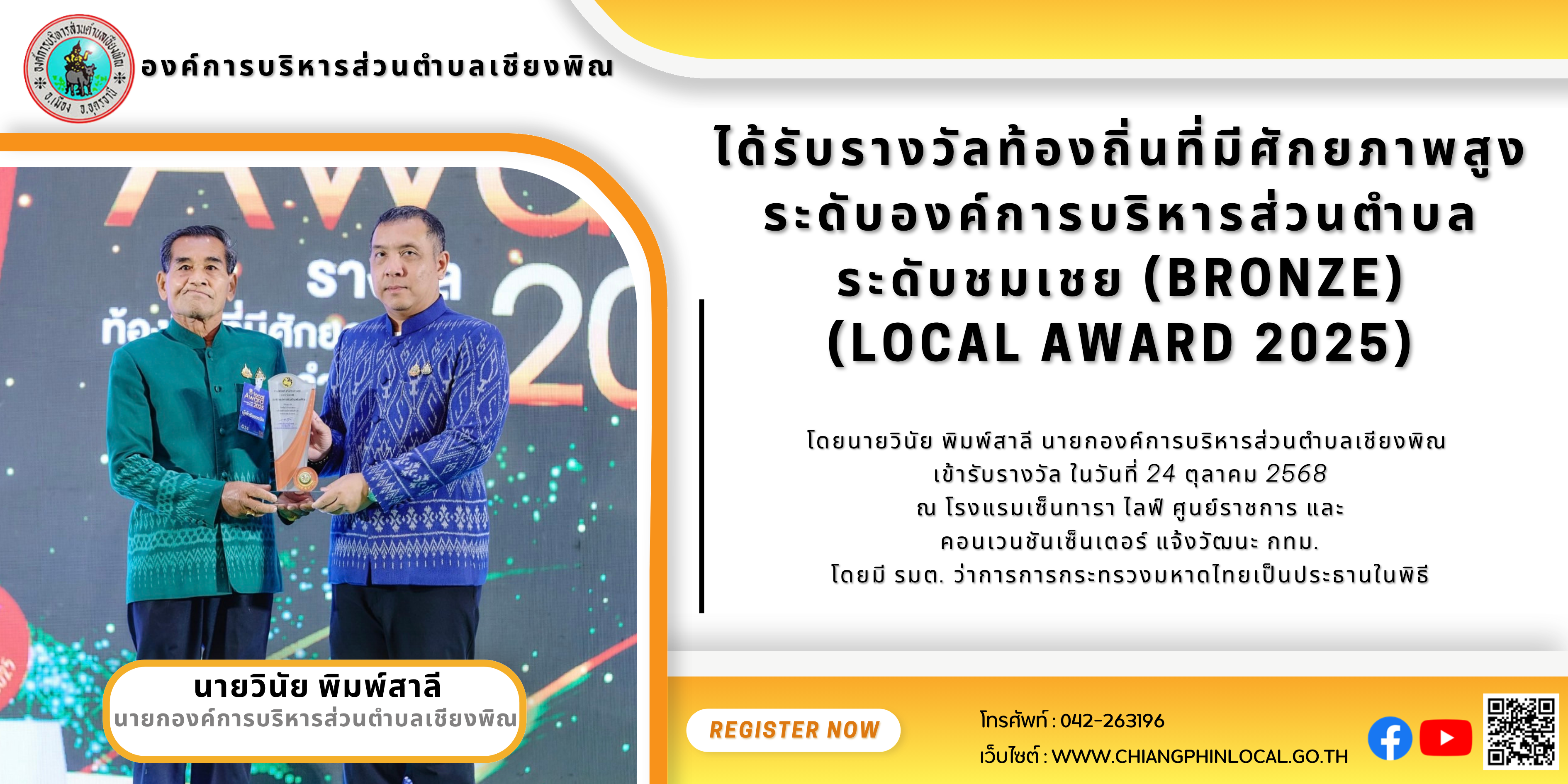 วันที่ 24 ตุลาคม 2568 นายวินัย พิมพ์สาลี นายกองค์การบริหารส่วนตำบลเชียงพิณ เข้ารับรางวัลท้องถิ่นที่มีศักยภาพสูง (Local Award 2025) ณ โรงแรมเซ็นทารา ไลฟ์ ศูนย์ราชการและคอนเวนชันเซ็นเตอร์ แจ้งวัฒนะ กทม. โดยมี รัฐมนตรีว่าการกระทรวงมหาดไทยเป็นประธานในพิธี